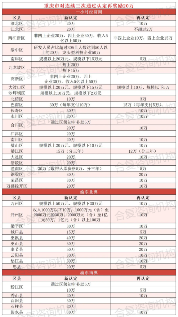 (1)市级培育高新技术企业奖励性后补助资金20万元/户。各区县另有10-100万的补贴。