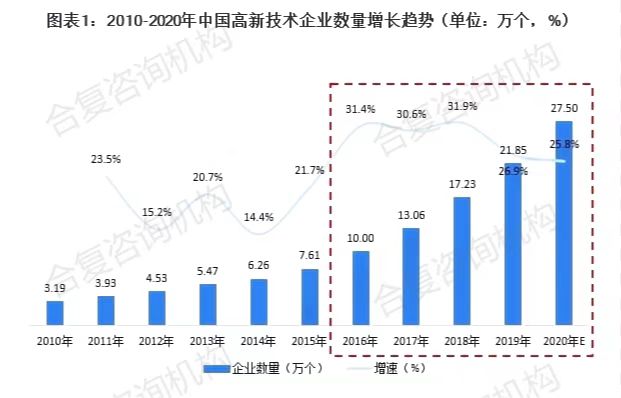数据显示,2010-2019年以来,我国高新技术企业数量不断增长,且年增速基本维持在15%以上,特别在”十三五”期间,数量增速均在25%以上。2019年,全国高新技术企业数量达21.85万个,同比增长26.9%;2020年,据国家税务局的相关数据统计,全国高新技术企业预计达27.5万个。
