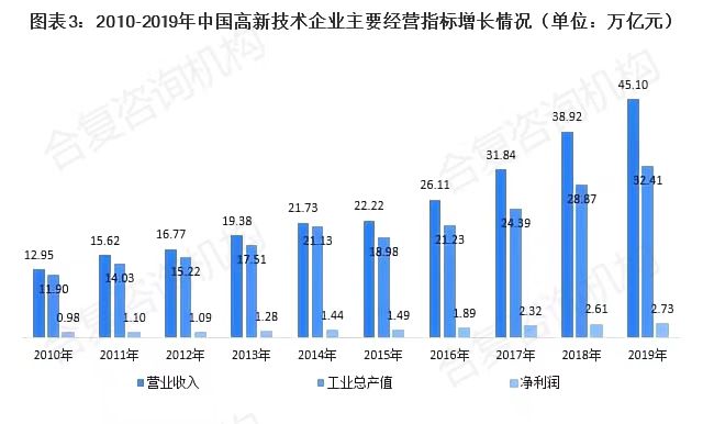 在企业数量高速增长的同时,我国高新技术企业的经营指标也不断增长。2019年,全国高新技术企业共实现营业收入45.1万亿元,同比增长15.9%;实现工业总产值28.87万亿元,同比增长12.3%;实现净利润2.73万亿元,同比增长4.6%。