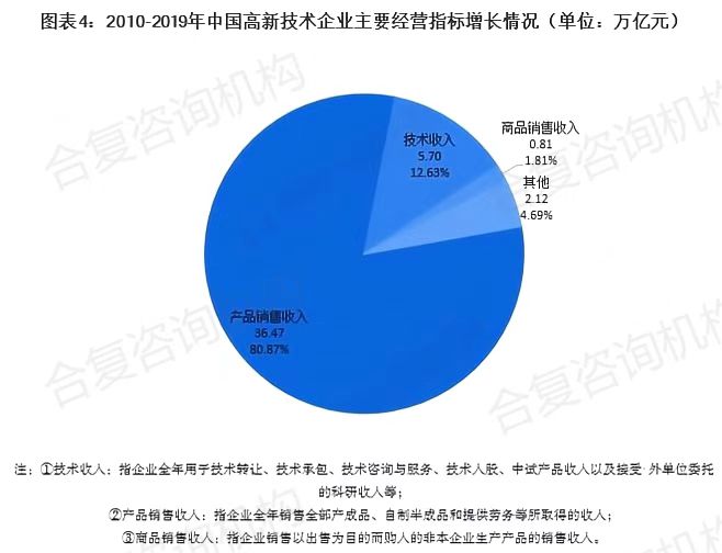 在营收结构中,全国高新技术企业实现的产品销售收入最多,达36.47万亿元,占营收比重达80.87%;其次是技术收入,共实现5.7万亿元,占比约12.63%。