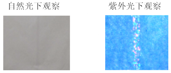 在日光下对光观察防伪线呈现黑色线状水印,使用标准365nm紫外光源垂直照射防伪线呈现红蓝荧光点形成的条状荧光带。