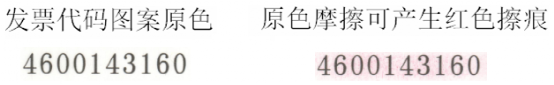 发票各联次左上方的发票代码使用防伪油墨印制,油墨印记在外力摩擦作用下可以发生颜色变化,产生红色擦痕(如下图所示)。