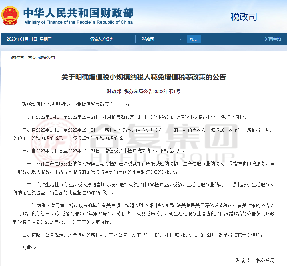 1月9日,财政部、税务总局制发《财政部 税务总局关于明确增值税小规模纳税人减免增值税等政策的公告》(财政部 税务总局公告2023年第1号),为确保相关政策顺利实施,税务总局制发《国家税务总局关于增值税小规模纳税人减免增值税等政策有关征管事项的公告》(国家...