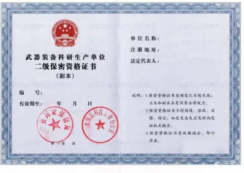 国家对涉密武器装备科研生产任务的企事业单位实行保密资格认定制度,自2021年7月1日起武器装备科研生产单位保密资格调整为一级、二级2个等级。国家军工保密资格认定委员会负责一级保密资格认定;省、自治区、直辖市军工保密资格认定委员会负责二级保密资格认定。保密资格证书有效期5年。