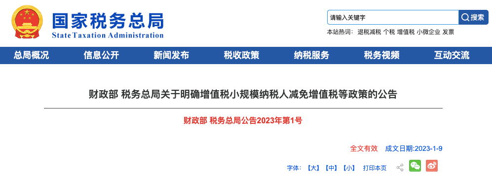 2023年1月10日,国家税务总局发布1号公告:小规模纳税人原适用3%征收率的项目减按1%征收增值税。